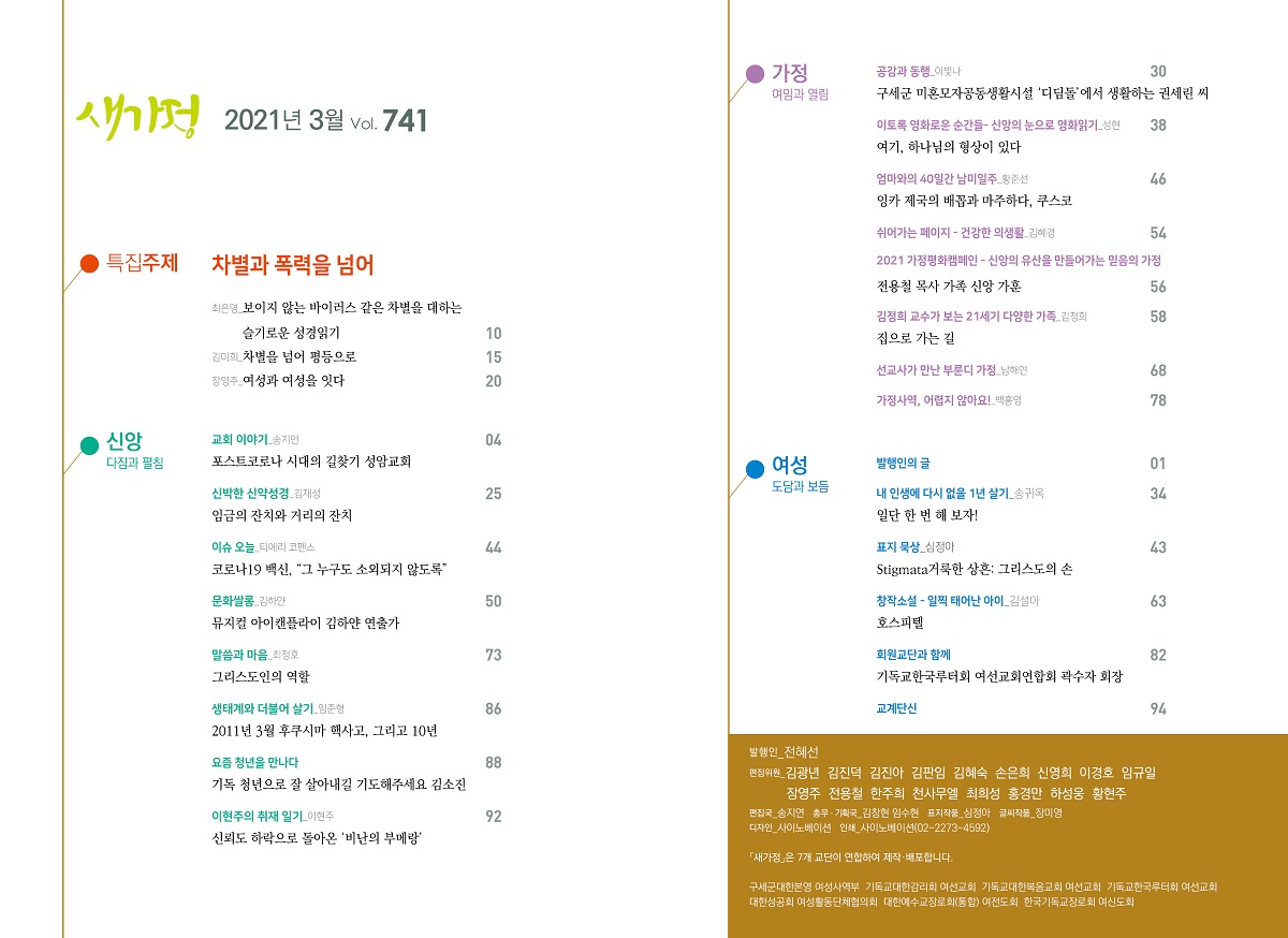 2021년 03월호관리자2023-10-24T12:13:19+09:00 월간 새가정 월간 새가정 2021년 3월호 주제는 ‘차별과 폭력을 넘어’입니다 최은영 박사의 [보이지 않는 바이러스 같은 차별을 대하는 슬기로운 성경읽기] 김미희 목사의 [차별을 넘어 평등으로] 장영주 사관의 [여성과 여성을 잇다] 그 외 다양한 내용을 새가정 3월호를 통해 만나보세요 ♥ 새가정 3월호 자료는 DBpia 에서 다운 받을 수 있습니다. 다운로드 받기리스트