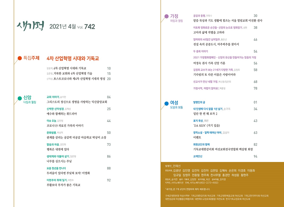 2021년 04월호관리자2023-10-24T12:17:42+09:00 월간 새가정 월간 새가정 2021년 4월호 주제는 ‘4차 산업혁명 시대와 기독교’입니다 장윤재 교수의 [4차 산업혁명 시대와 기독교] 김준영 목사의 [거룩한 교회와 4차 산업혁명 기술] 신익상 교수의 [포스트코로나와 제4차 산업혁명 시대의 영성] 그 외 다양한 내용을 새가정 4월호를 통해 만나보세요 ♥ 새가정4월호 자료는 DBpia 에서 다운 받을 수 있습니다. 다운로드 받기리스트