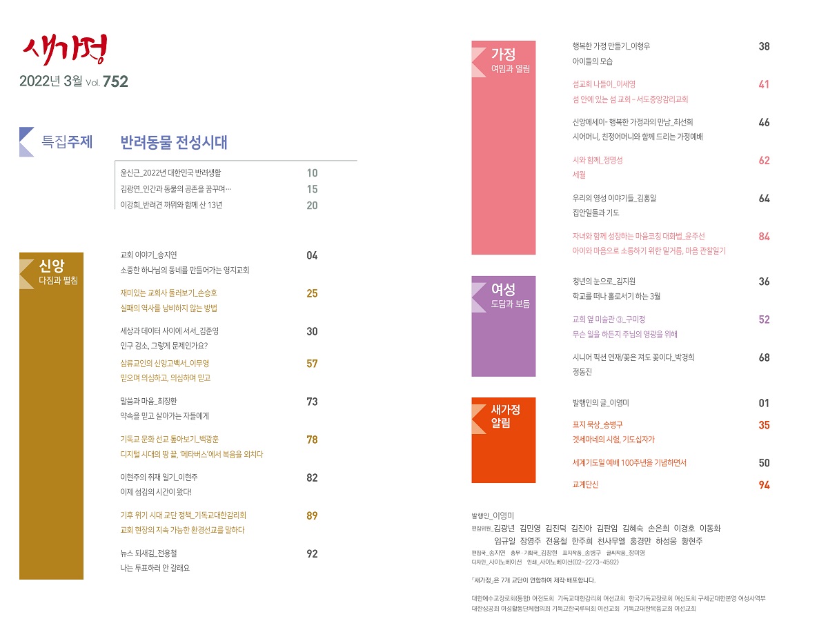 2022년 03월호관리자2023-12-01T16:25:15+09:00 월간 새가정 월간 새가정 2022년 3월호 주제는 ‘반려동물 전성시대’입니다 윤신근 박사의 [2022년 대한민국 반려생활] 김광연 교수의 [인간과 동물의 공존을 꿈꾸며…] 이강희 연구자의 [반려견 까뮈와 함께 산 13년] 그 외 다양한 내용을 새가정 3월호를 통해 만나보세요 ♥ 새가정3월호 자료는 DBpia 에서 다운 받을 수 있습니다. 다운로드 받기리스트