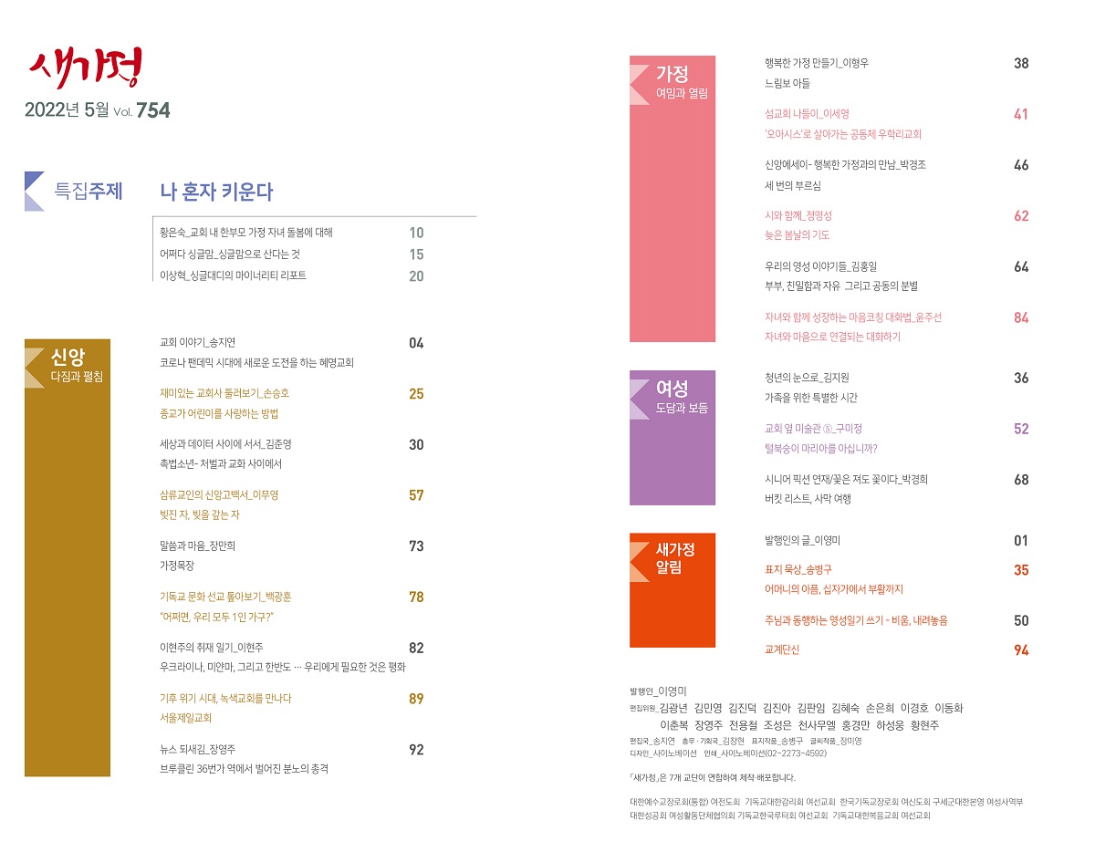 2022년 05월호관리자2023-12-01T16:36:12+09:00 월간 새가정 월간 새가정 2022년 5월호 주제는 ‘나 혼자 키운다’입니다 황은숙 회장의 [교회 내 한부모 가정 자녀 돌봄에 대해] 어쩌다 싱글맘의 [싱글맘으로 산다는 것] 이상혁 싱글대디의 [싱글대디의 마이너리티 리포트] 그 외 다양한 내용을 새가정 5월호를 통해 만나보세요 ♥ 새가정5월호 자료는 DBpia 에서 다운 받을 수 있습니다. 다운로드 받기리스트