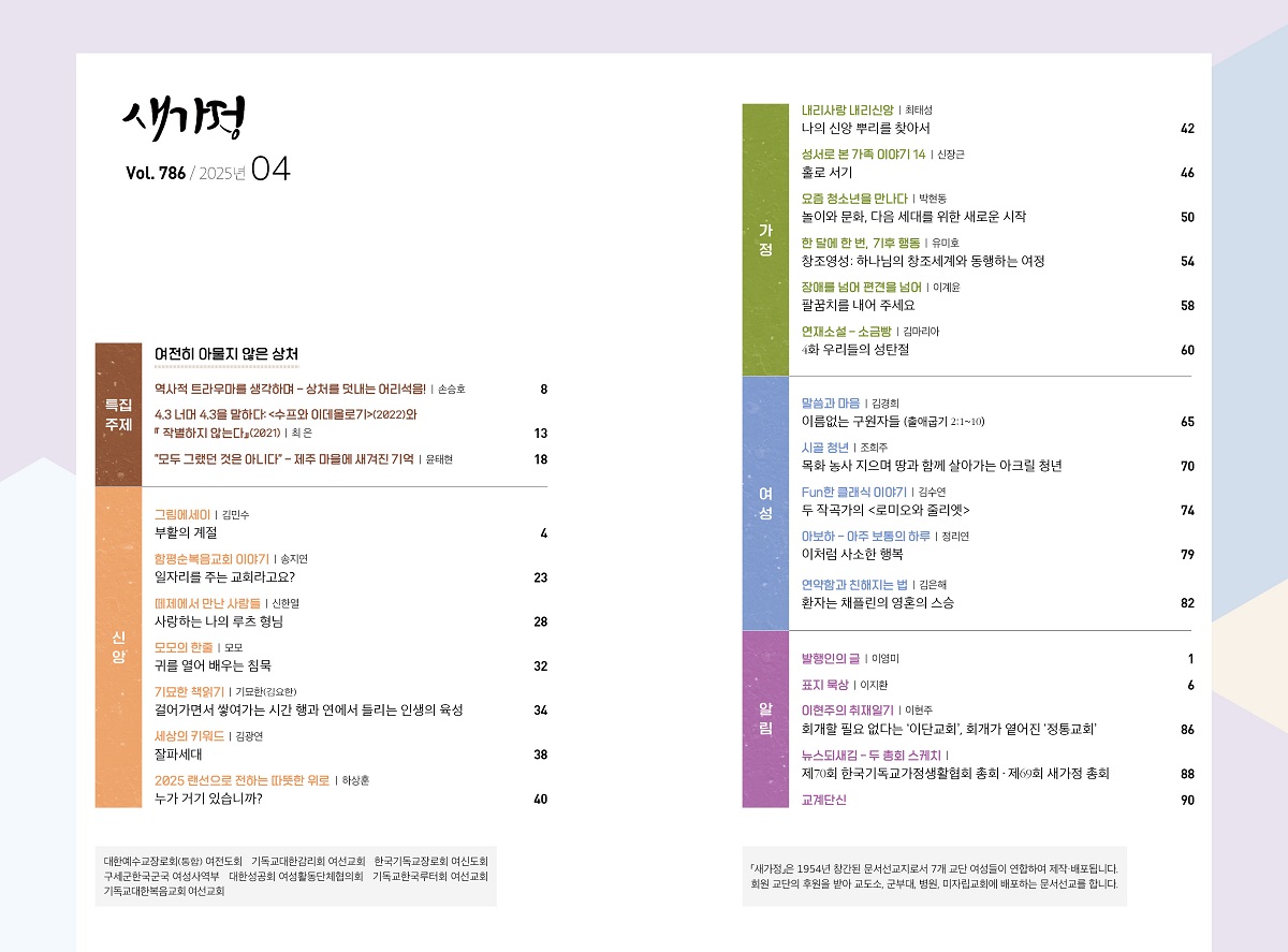 2025년 04월호관리자2025-05-16T12:51:22+09:00 월간 새가정 월간 새가정 2025년 4월호 주제는 ‘여전히 아물지 않은 상처’입니다 손승호 교수의 [역사적 트라우마를 생각하며-상처를 덧내는 어리석음] 최은 평론가의 [4.3 너머 4.3을 말하다] <수프와이데올로기><작별하지 않는다> 윤태현 목사의 [“모두 그랬던 것은 아니다” – 제주 마을에 새겨진 기억] 그 외 다양한 내용을 새가정 4월호를 통해 만나보세요 ♥ 새가정4월호 자료는 DBpia 에서 다운 받을 수 있습니다. 다운로드 받기리스트